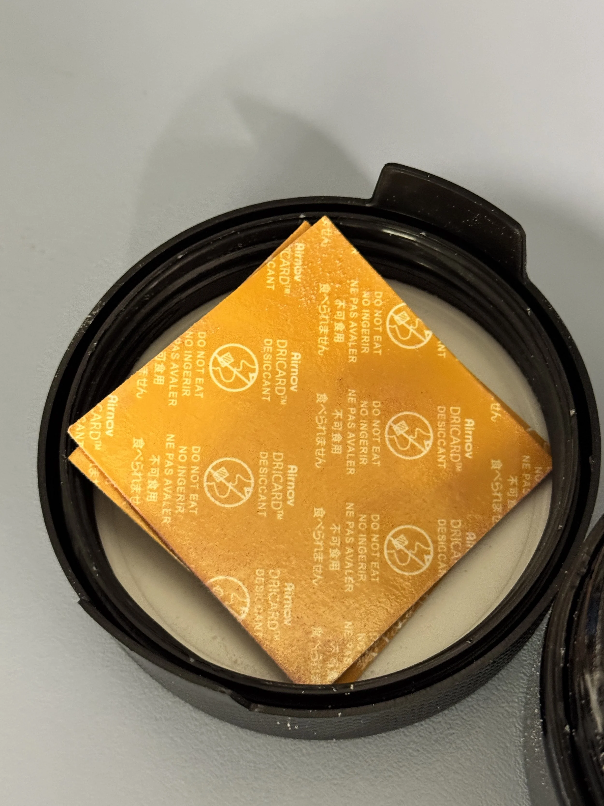 Remove the DRICARD Desiccant from the powder. Place in the lid of the container.