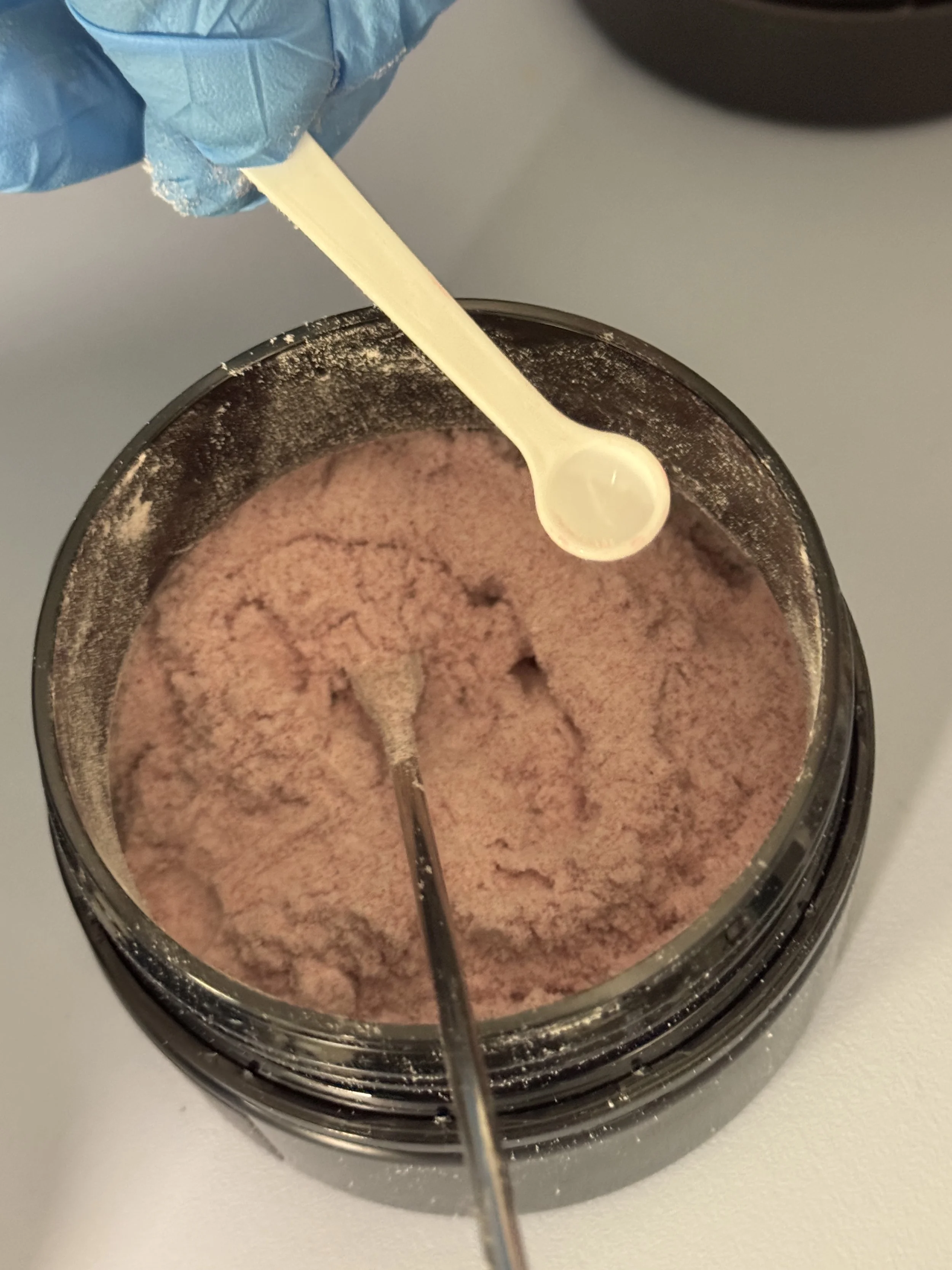 Remove the 1/16th .3ml Dosing Spoon from the powder. Pace in the lid of the container.